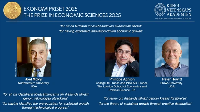 Nobelovu cenu za ekonomii pro rok 2025 získali tři významní ekonomové – Joel Mokyr z Northwestern University v USA, Philippe Aghion z Collège de France, INSEAD a London School of Economics a Peter Howitt z Brown University. Byli oceněni za přelomový výzkum inovací, hospodářského růstu a takzvané kreativní destrukce, tedy procesu, při němž nové technologie a myšlenky nahrazují staré způsoby výroby a produkty. Jejich práce zásadně přispěla k pochopení toho, jak inovace pohánějí dlouhodobý růst a zlepšují životní úroveň po celém světě.
