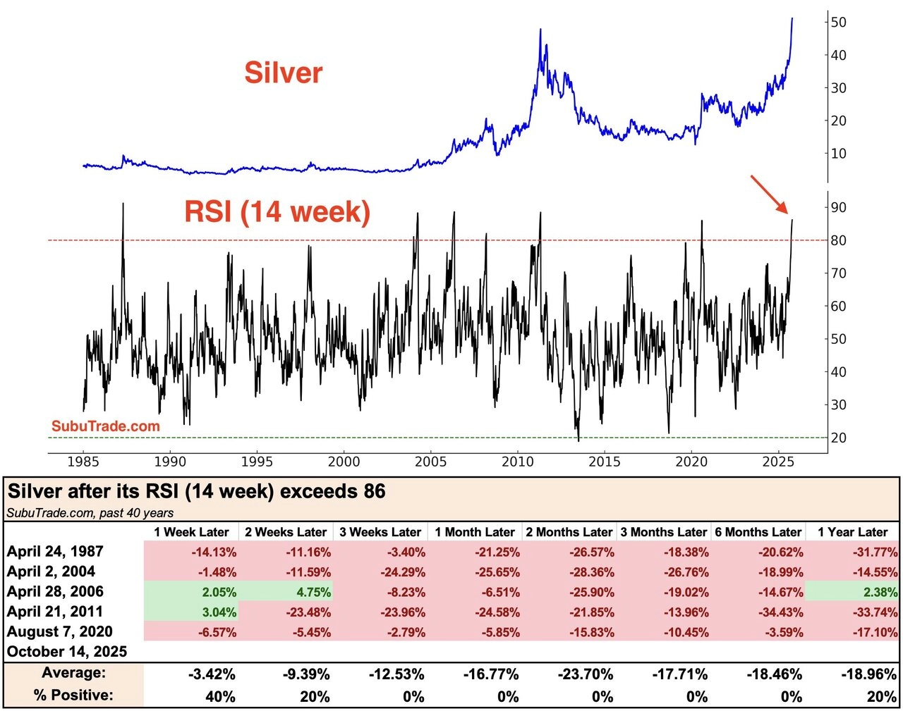 Růst ceny stříbra výrazně zrychlil v posledních několika týdnech. 14týdenní index relativní síly v důsledku toho stoupl už nad 86 bodů, pásmo překoupenosti je přitom už nad 70 body. Tabulka shrnuje, jak se cena kovu vyvíjela v minulosti poté, co 14týdenní RSI vystoupal nad 86 bodů. Každá doba je jiná, případná konsolidace nebo korekce ceny stříbra by ale neměla v dalších dnech a týdnech nikoho překvapit.