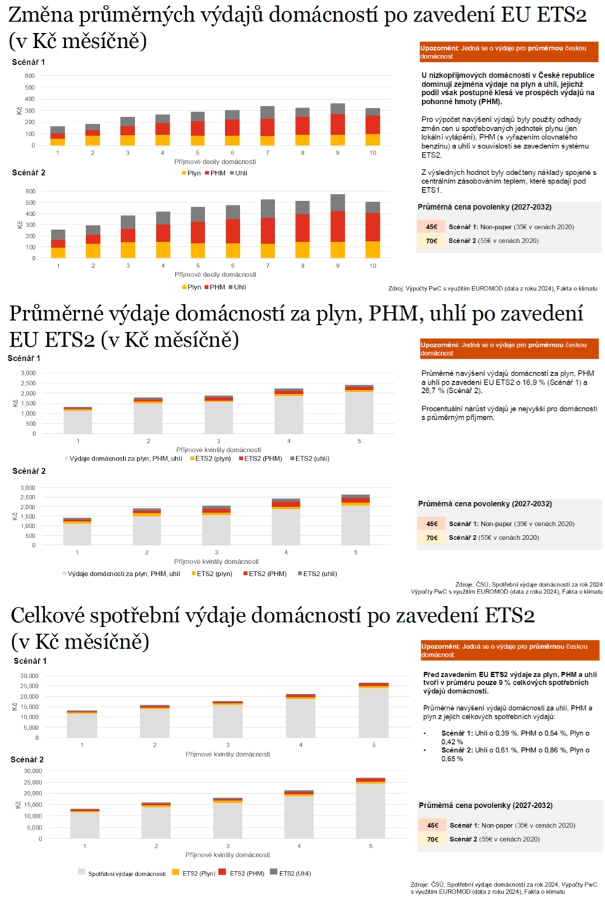 Průměrné měsíční výdaje domácností za energie a paliva se zvýší o 200 až 400 korun. Při vyšších cenách povolenky by bylo navýšení asi o sto korun vyšší. V přepočtu na celý rodinný rozpočet jde o 1–2 % výdajů navíc. Největší procentuální nárůst výdajů vychází rodinám s průměrnými příjmy, protože kombinují vyšší náklady na topení i dopravu. Naopak nejbohatší domácnosti často bydlí v úspornějších domech nebo jezdí elektromobily, takže u nich by byl dopad relativně menší.