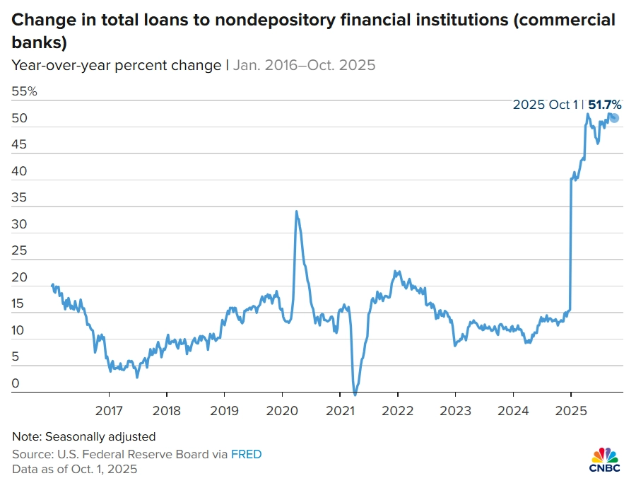 V centru pozornosti se ocitl trh s půjčkami pro takzvané NDFI, tedy nebankovní finanční instituce (nondepository financial institutions). Tyto subjekty, mezi které patří hypoteční společnosti, pojišťovny nebo fondy soukromého kapitálu, poskytují úvěry mimo tradiční bankovní sektor.