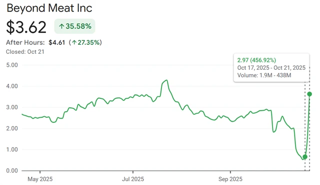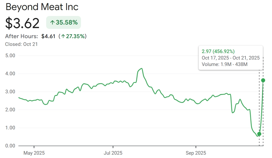 Prudký obrat přichází jen několik dní poté, co se cena akcií propadla o více než dvě třetiny v reakci na oznámení uzavření dluhové dohody. Díky té společnost výrazně prodloužila splatnost svých stávajících dluhopisů, ovšem za cenu takzvaného ředění akcionářských podílů, protože nové konvertibilní dluhopisy se za určitých podmínek budou převádět na akcie. Ještě minulý týden se akcie Beyond Meat obchodovaly za 0,65 USD, v úterním after-marketu jejich cena byla přes čtyři dolary.