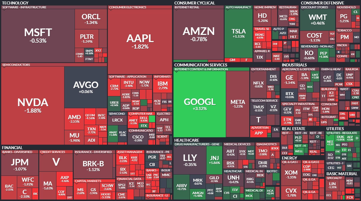 Index Dow klesl o 1,18 % na 46 590,24 bodu, širší S&P 500 odepsal 0,92 % na 6 672,41 bodu a index technologického trhu Nasdaq Composite uzavřel se ztrátou 0,84 % na 22 708,07 bodu, přičemž S&P 500 i Nasdaq klesly pod své 50denní klouzavé průměry. Index volatility VIX vyskočil o 12,86 % na 22,38 bodu a výnos 10letých vládních dluhopisů USA se snížil o jeden a půl bazického bodu na 4,133 %.