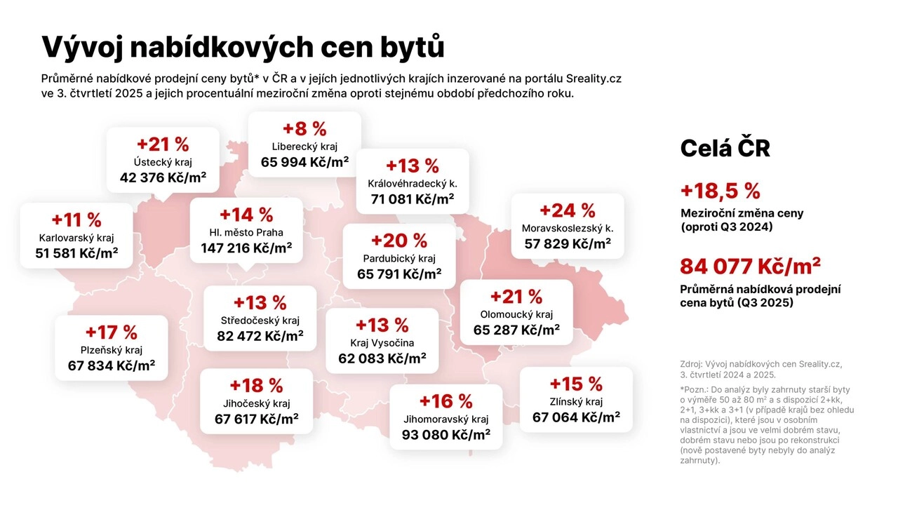 Ve třetím čtvrtletí 2025 byla průměrná nabídková cena bytů v Česku inzerovaných na portálu Sreality.cz 84 077 Kč/m2. V porovnání s třetím kvartálem 2024 nabídkové ceny bytů meziročně vzrostly o 18,5 %.