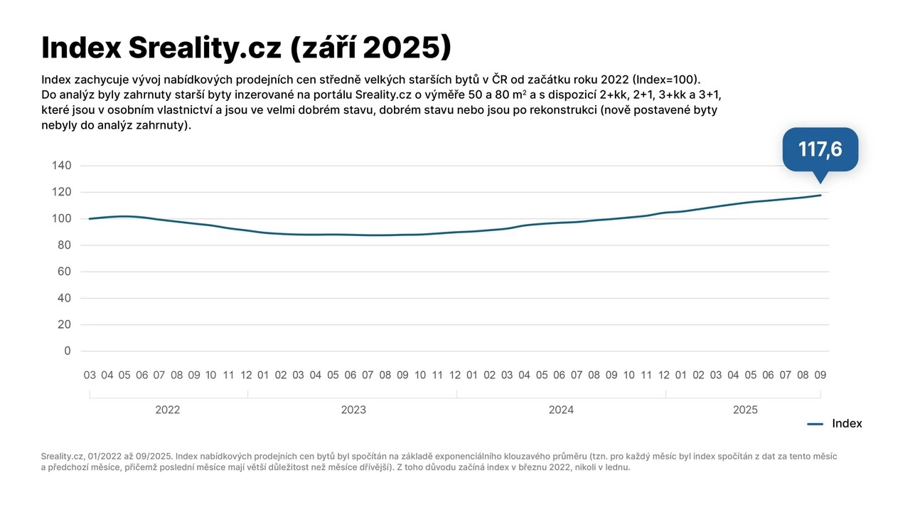 V letošním třetím čtvrtletí byly nabídkové prodejní ceny středně velkých starších bytů v České republice o 18,5 % vyšší než ve stejném období loni. Vyplývá to z aktuálních dat portálu Sreality.cz a Indexu Sreality.cz, který sleduje vývoj nabídkových cen bytů v celém Česku. Křivka růstu podle tohoto indexu v posledních měsících konstantně roste. V Moravskoslezském kraji byty dokonce meziročně zdražily téměř o čtvrtinu.