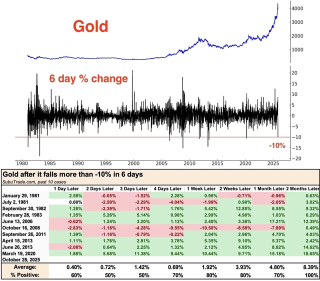 Cena zlata má za sebou prudkou korekci z historického maxima, kdy během šesti obchodních dnů spadla o více než 10 %. K něčemu podobnému došlo zatím v historii desetkrát a ve výhledu na další dva měsíce cena kovu nikdy dále neklesla a v průměru narostla o více než 8 %. Ve středu cena kovu přidávala od jednoho do dvou procent.