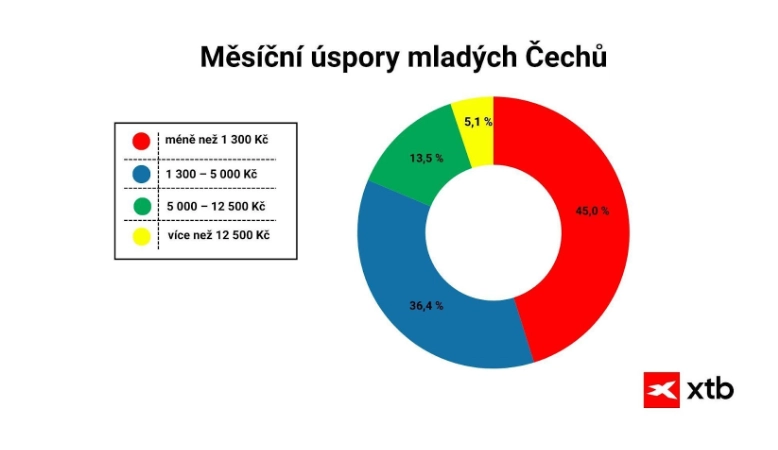Mladí Češi sice myslí na budoucnost, jejich úspory ale často nestačí ani na krátkodobou krizi. Skoro polovina z nich si měsíčně odkládá méně než 1 300 korun, přičemž nejvíce jsou v této kategorii zastoupeni lidé se základním vzděláním (63,6 %). Naopak pouze 5,1 % z nich si je schopno a ochotno dát stranou více než 12 500 korun.