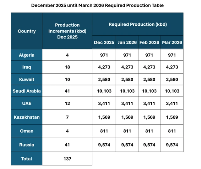 OPEC+ tak od letošního dubna zvýšil produkci už o více než 2,7 milionu barelů denně, což představuje asi 2,5 % světové poptávky. Ceny ropy, které v říjnu spadly na pětiměsíční minimum kolem 60 dolarů za barel, se díky sankcím vůči Rusku a optimistickým vyhlídkám obchodních jednání USA zotavily přibližně na 65 dolarů.