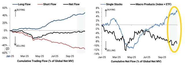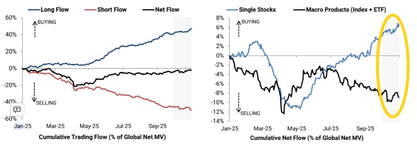 Hedgeové fondy podle Goldman Sachs pokračují v trendu vyvažování dlouhých pozic v jednotlivých akciích krátkými pozicemi na indexy. V říjnu již druhý měsíc po sobě čistě nakupovaly globální akcie, přičemž růst dlouhých pozic (spekulací na růst ceny) v jednotlivých titulech převážil nad zvýšeným prodejem takzvaných makroproduktů (indexů a ETF).
