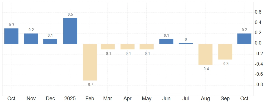 Podle údajů Národního statistického úřadu Číny vzrostl index spotřebitelských cen v říjnu meziročně o 0,2 %, což překonalo očekávání analytiků, kteří počítali se stagnací cen. Jde o nejsilnější výsledek od ledna a první růst od června. Měsíčně ceny vzrostly rovněž o 0,2 %. Ceny potravin sice meziročně klesly o 2,9 %, oproti září však mírně stouply.