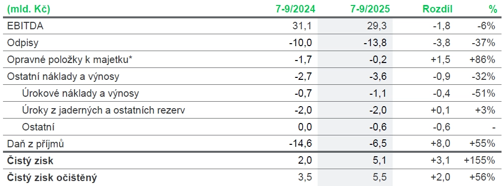 Za samotné třetí čtvrtletí ČEZ vykázal výnosy 72,9 miliardy korun (meziročně -12 %), EBITDA 29,3 miliardy (meziročně -6 %), čistý zisk 5,1 miliardy (meziročně +155 %) a očištěný čistý zisk 5,5 miliardy korun (meziročně +56 %). Čistý zisk byl podpořen meziročně nižší efektivní daňovou sazbou (56 % proti 88 % v loňském třetím čtvrtletí), kdy efektivní daňová sazba v jednotlivých čtvrtletích výrazně kolísá kvůli odhadu daně z neočekávaných zisků. ČEZ teď odhaduje, že za celý rok na windfall tax odvede 31–34 miliard korun, dosud vyhlížel odvod 29–33 miliard.