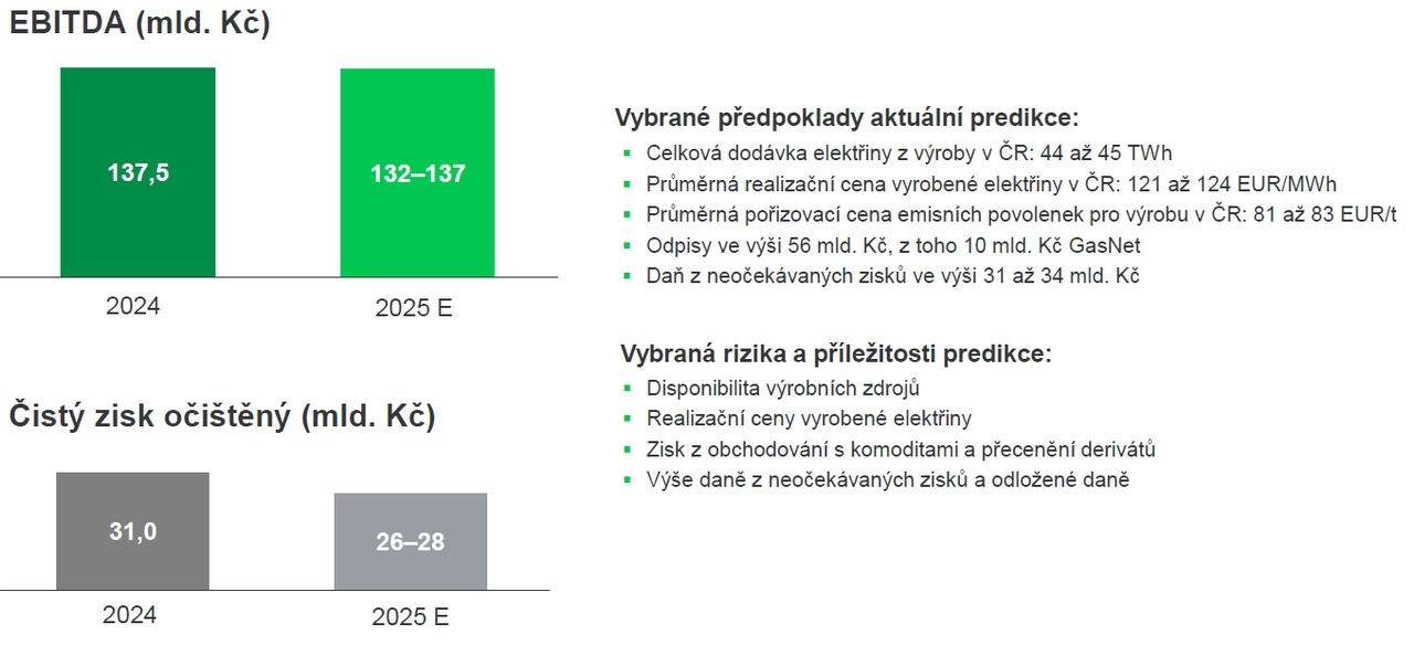 Ve výhledu společnost potvrdila, že za celý rok čeká EBITDA 127–132 miliard korun, pásmo výhledu pro čistý zisk pak zúžila na 26–28 miliard z 25–29 miliard. Výhled podporují prodejní ceny vyrobené elektřiny, nižší provozní náklady nebo vyšší výnosy z distribuce a připojovací poplatky.