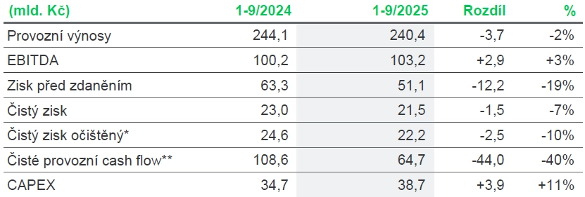 Provozní výnosy za tři čtvrtletí dosáhly 240,4 miliardy korun, meziročně o 2 % méně. EBITDA byl 103,2 miliardy, což znamená proti loňsku zlepšení o 2,9 miliardy. Naopak čistý zisk 21,5 miliardy značí zhoršení o 1,5 miliardy. Čísla podpořilo začlenění akvírovaného distributora plynu GasNet do výsledků skupiny od loňského září, výsledky distribuce elektřiny a segmentu prodej a vyšší výroba jaderných elektráren. Naopak negativně meziročně působilo snížení realizačních cen vyrobené elektřiny a nižší zisk z obchodování s komoditami.