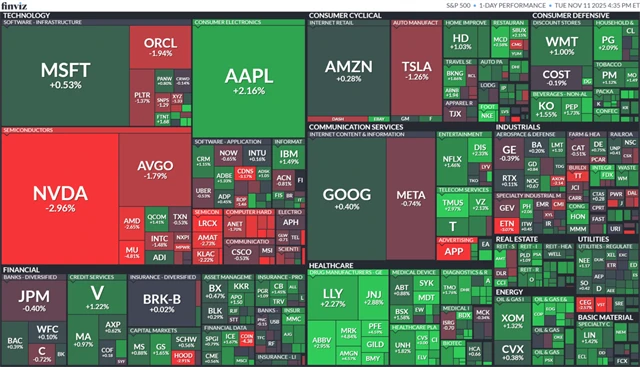 K nejvíce ztrátovým titulům se zařadila společnost CoreWeave (-16,31 %), která provozuje cloudovou infrastrukturu pro umělou inteligenci. Její akcie výrazně ztrácely po zveřejnění slabého výhledu, který zasáhl celý segment AI. Akcie výrobce čipů NVIDIA (-2,96 %) oslabily poté, co SoftBank prodala celý svůj podíl ve firmě v hodnotě přes 5 miliard dolarů.