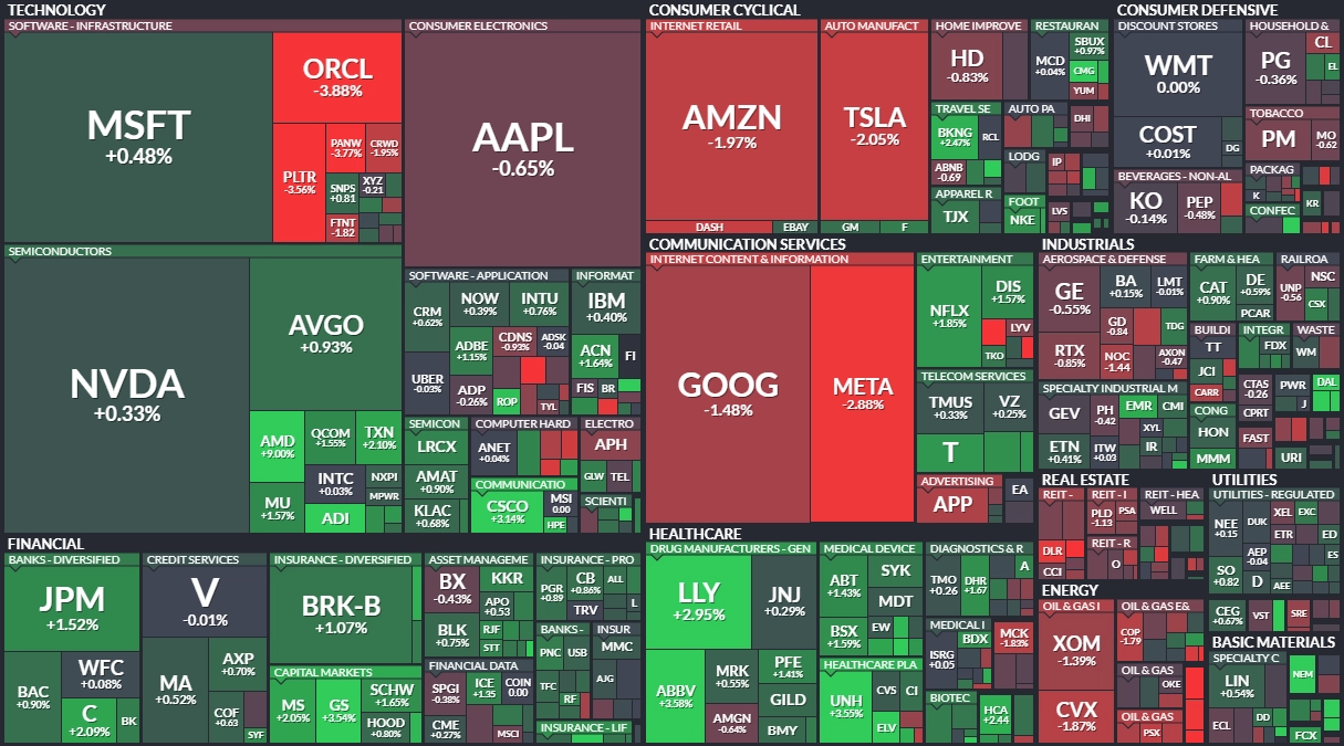 Mimo finanční sektor pokračoval volatilní vývoj u akcií spojených s umělou inteligencí, protože mezi investory přetrvává nejistota, zda nejsou valuace technologických firem po nedávném prudkém růstu cen akcií příliš vysoké. Cena akcií Advanced Micro Devices (+9,00 %) výrazně vzrostla, zatímco akcie Oraclu (-3,88 %) a Palantiru (-3,56 %) oslabily.