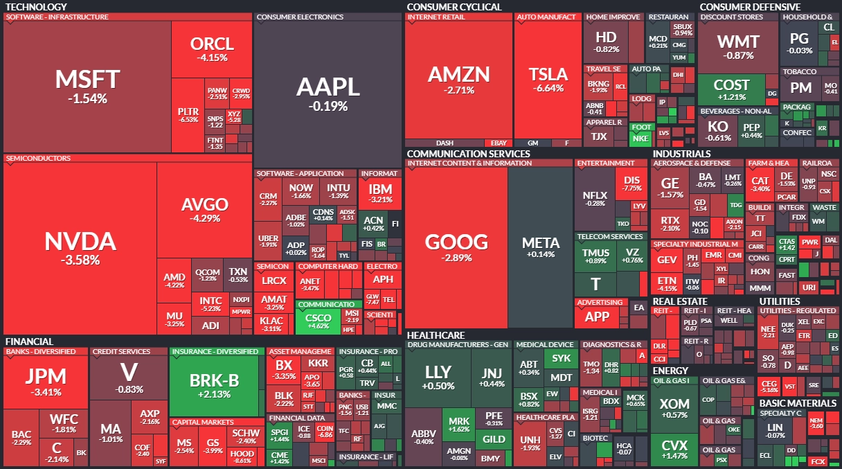 Index Dow klesl o 1,65 % na 47 457,22 bodu, širší S&P 500 odepsal 1,66 % na 6 737,49 bodu a index technologického trhu Nasdaq Composite spadl o 2,29 % na 22 870,36 bodu. Index volatility VIX vyskočil o 14,22 % na 20 bodů a výnos 10letých vládních dluhopisů USA se zvýšil o tři a půl bazického bodu na 4,115 %.