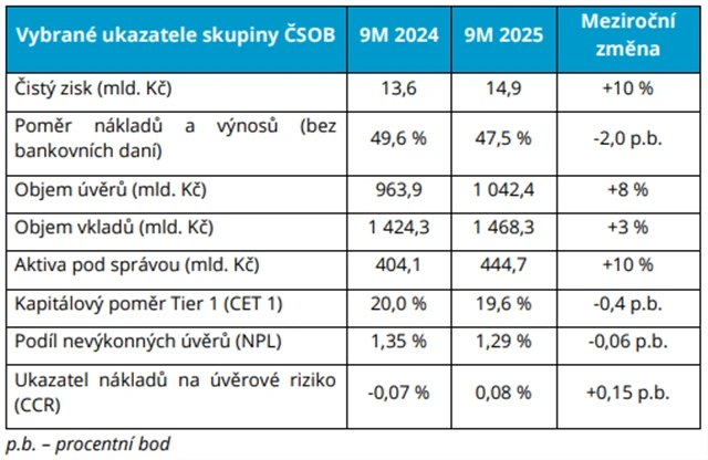Hospodářské výsledky ukázaly růst napříč hlavními segmenty. Objem úvěrů na bydlení stoupl meziročně o 8 % na 575 miliard korun, zatímco úvěry firmám a podnikatelům vzrostly na 413 miliard korun, tedy o 7 %. Celkové vklady dosáhly 1,468 bilionu korun a klientské vklady činily 1,311 bilionu, oba ukazatele se zlepšily o tři procenta. Silnou výkonnost zaznamenala také investiční oblast – aktiva pod správou narostla na 445 miliard korun a majetek v podílových fondech se zvýšil o 14 % na 307 miliard.