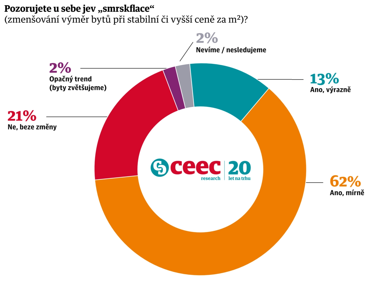 Z průzkumu CEEC Research také vyplývá, že 62 % developerů vnímá zmíněný trend smrskflace jako mírný, zatímco 13 % ho považuje za výrazný. 21 % respondentů nezaznamenalo žádnou změnu, a 2 % to vnímají dokonce opačně.