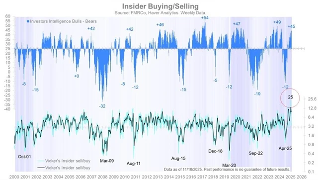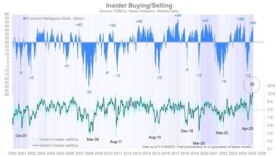 "Zatímco nálada mezi retailovými investory i na Wall Street se koncem října začala zlepšovat, firemní insideři prodávali akcie nejvíce od roku 2000. Poměr prodejů a nákupů obvykle vysílá smysluplné signály spíše při tržních minimech, kdy manažeři nakupují akcie svých firem za snížené ceny. Důvodů, proč akcie naopak prodávají, může být spousta, třeba zkrátka jen zpeněžují své bonusy a podobně. Ani v současnosti tak vysoká míra prodejů nemusí znamenat nic zásadního. Ale vzhledem k probíhajícím debatám o vysokých valuacích, spekulativních bublinách a ambiciózních ziskových výhledech je současný poměr prodejů a nákupů okolo 25 něco, co mě minimálně nutí k zamyšlení," říká Jurrien Timmer ze společnosti Fidelity Investments.