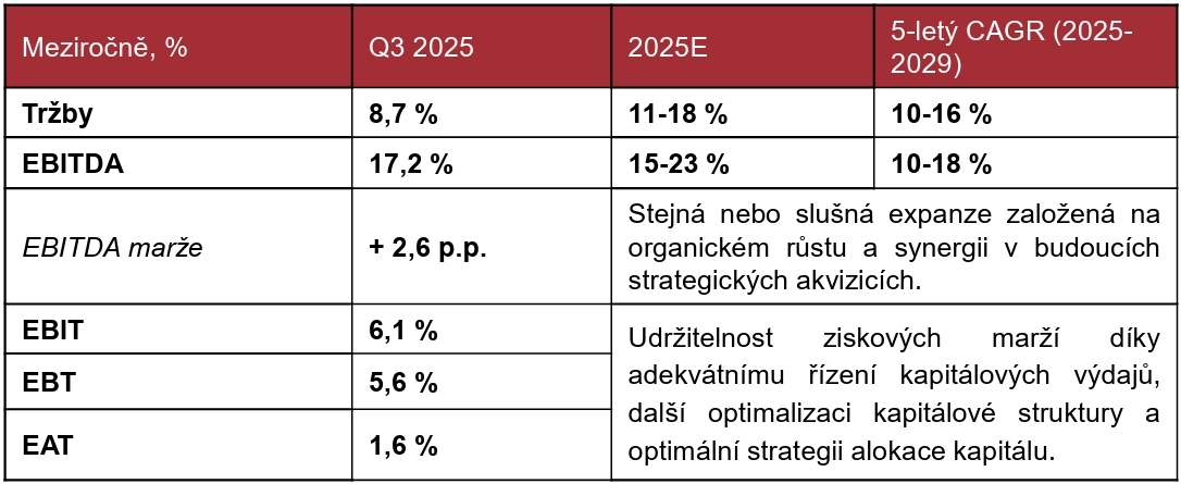 Na základě výsledků dosažených v třetím čtvrtletí, které potvrdily pokračující růst tržeb díky získávání nových zákazníků a strategickým akvizicím, společnost očekává růst tržeb za celý rok na úrovni 11 až 18 % a růst EBITDA tempem 15 až 23 %. Vyšší EBITDA rovněž podporuje předpoklad růstu EBIT, zisku před zdaněním i zisku po zdanění.