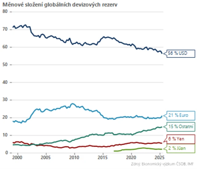 Ale od teorie k praxi. Podíl dolaru na globálních měnových rezervách (bez zlata) klesl ze 70 % na přelomu tisíciletí na aktuálních 56 %. Jaké má americká měna vyzyvatele? Euro dlouhodobě stagnuje okolo 20% podílu, ale eurozóna je institucionálně nedovařený projekt, chybí jí společná fiskální politika i dluh jako alternativa bezrizikového aktiva k americkým vládním dluhopisům. A Čína? Jüan má podíl jen 2 %, ale hlavně přísné kapitálové kontroly, což ho z pomyslného klání automaticky vylučuje.