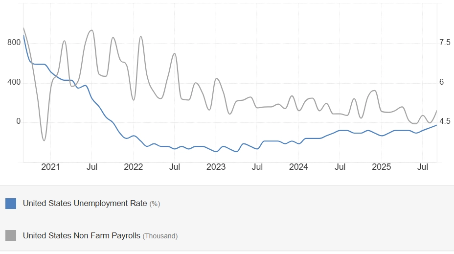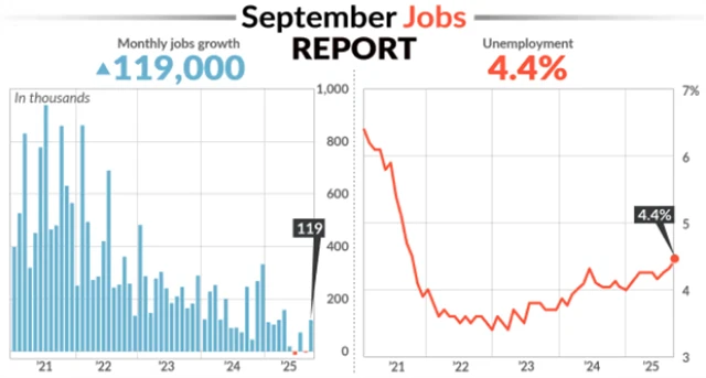 Celková míra nezaměstnanosti v září stoupla o desetinu procentního bodu na 4,4 %, když se čekala stagnace na 4,3 %, zatímco nezaměstnanost U6, která bere v úvahu také ty, kteří už hledání práce vzdali, a rovněž ty, kteří jsou zaměstnáni jen na částečný úvazek, ačkoli by chtěli pracovat na plný, se snížila o desetinu procentního bodu na 8 %.