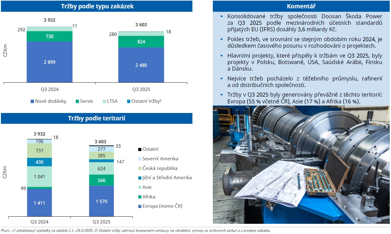 Strojírenské společnosti Doosan Škoda Power se v období od ledna do září meziročně snížily tržby o 8,4 % na 3,60 miliardy korun. Zároveň ale firma oznámila nárůst hodnoty nevyřízených zakázek ke konci třetího kvartálu o téměř třetinu na přibližně 13 miliard korun.