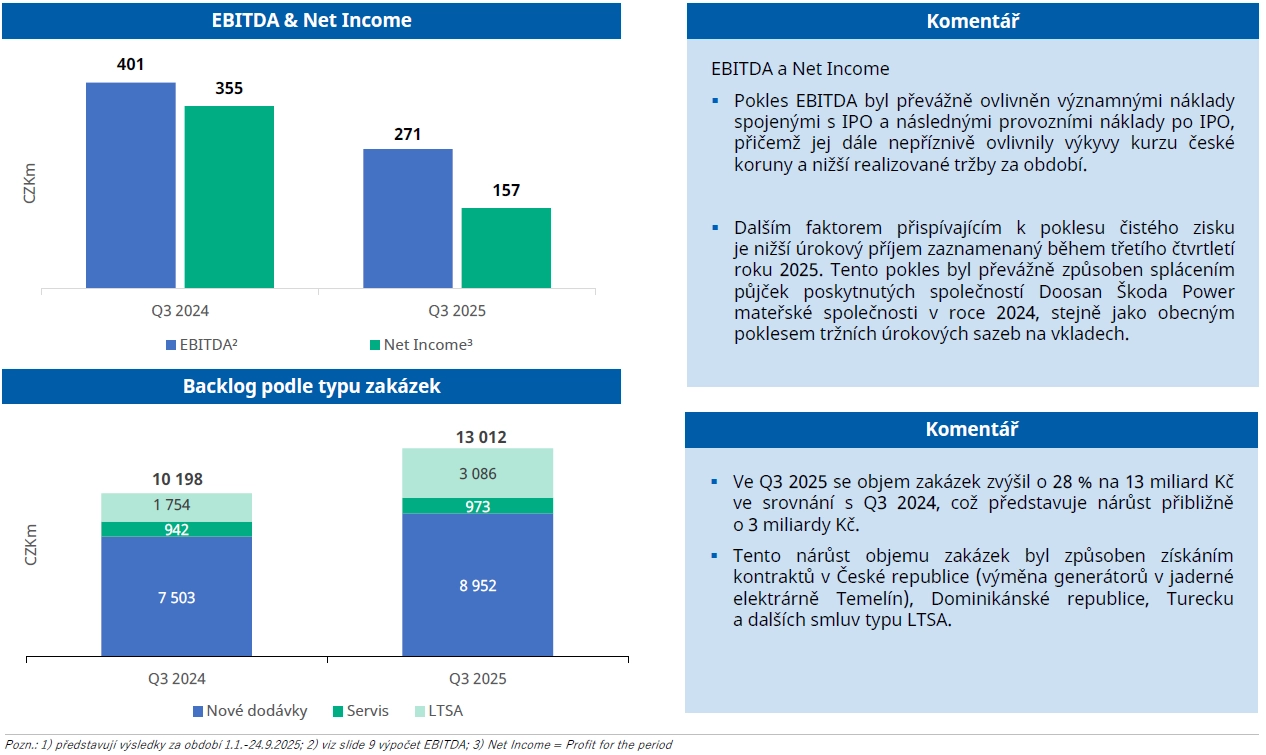 "Společnost se v dosavadním průběhu roku 2025 musela vypořádat s řadou výzev v souvislosti se vstupem na Burzu cenných papírů Praha. Bohužel musela také čelit zpoždění v rozhodování některých projektů, což negativně ovlivnilo objem realizovaných tržeb v aktuálním období. Zároveň firma věnovala velké úsilí získání klíčových zakázek v České republice, kde si chce udržet pozici nejvýznamnějšího partnera pro energetický sektor. Společnost rovněž spustila strategické aktivity, jejichž cílem je optimalizace a zefektivnění výroby stávajících produktů. V neposlední řadě také byla zahájena příprava na rozšíření výrobních schopností pro možnost využití synergie při realizaci projektů s dalšími společnostmi v rámci skupiny Doosan," uvedl k výsledkům předseda představenstva Doosan Škoda Power Youngki Lim.