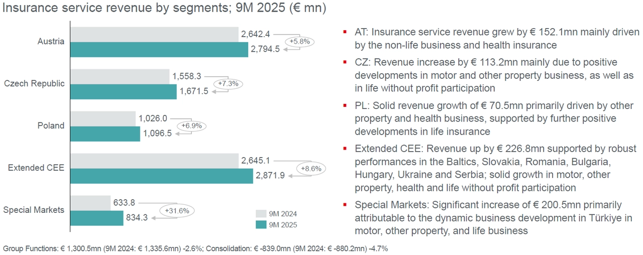 Hrubé předepsané pojistné se VIG se v prvních devíti měsících roku zvýšilo meziročně o 8,6 % a výnosy z pojišťovacích aktivit jí narostly rovněž o 8,6 % na 9,7 miliardy eur. V Rakousku, které je pro VIG největším trhem, narostly příjmy z pojišťovacích aktivit o 5,8 % na 2,79 miliardy eur a v Česku se zvýšily o 7,3 % na 1,67 miliardy eur.