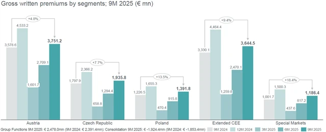 Hrubé předepsané pojistné v Rakousku stouplo o 4,8 % na 3,75 miliardy eur, v Česku se zvýšilo o 7,7 % na 1,94 miliardy eur a v Polsku vyskočilo o 13,5 % na 1,39 miliardy eur.