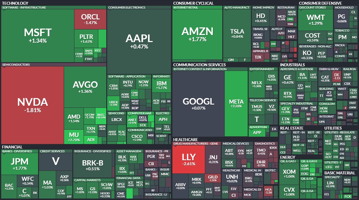 V pátek index Dow přidal 0,61 % na 47 716,42 bodu, S&P 500 se zvýšil o 0,54 % na 6 849,09 bodu a index technologického trhu Nasdaq Composite uzavřel se ziskem 0,65 % na 23 365,69 bodu. Index volatility VIX spadl o 4,89 % na 16,35 bodu a výnos 10letých vládních dluhopisů USA se zvýšil o necelé dva bazické body na 4,015 %.