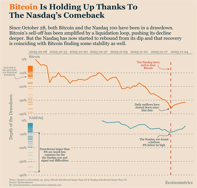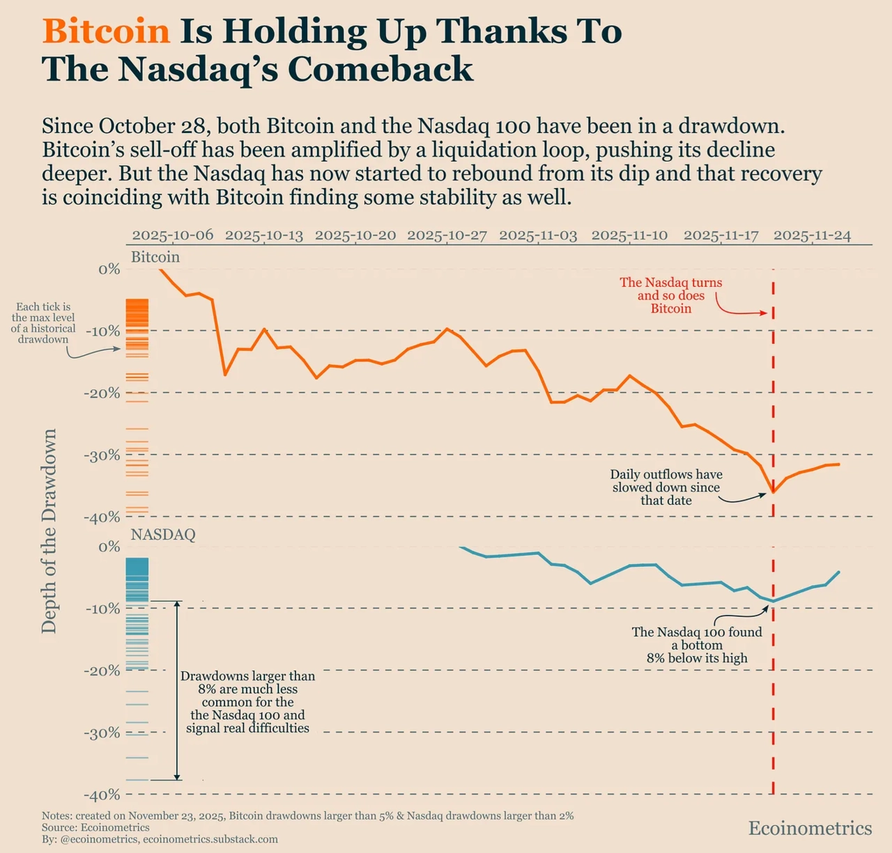 Ke stabilizaci na trhu s bitcoinem přispěl v uplynulém týdnu i širší tržní sentiment. Na kurz bitcoinu v listopadu negativně, stejně jako na trh s akciemi technologických firem, působila zvýšená averze k riziku. První fáze výprodeje začala už v říjnu pod tíhou obav z dopadů cel, shutdownu americké vlády a ochlazení nálady na akciovém trhu. Pak se Nasdaq-100 krátkodobě vzpamatoval a zdálo se, že tako cena bitcoinu našla krátkodobé dno.