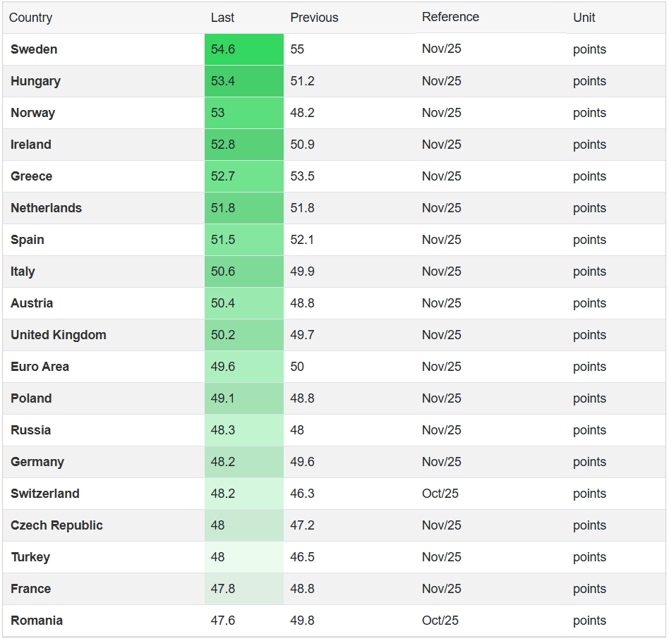 Evropské finální listopadové indexy nákupních manažerů ve výrobě