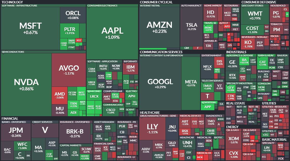 Index Dow stoupl o 0,39 % na 47 474,46 bodu, širší S&P 500 se zvýšil o 0,25 % na 6 829,37 bodu a index technologického trhu Nasdaq Composite si připsal 0,59 % a den zakončil na 23 413,67 bodu. Index volatility VIX spadl o 3,77 % na 16,59 bodu a výnos 10letých vládních dluhopisů USA se snížil o půl bazického bodu na 4,090 %.