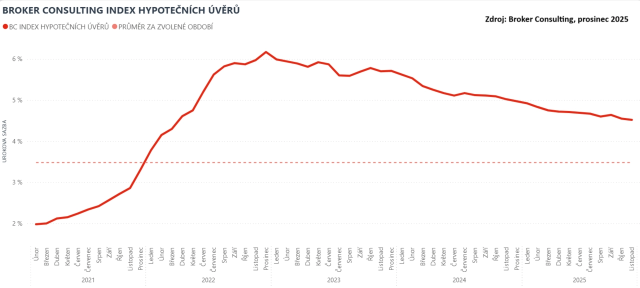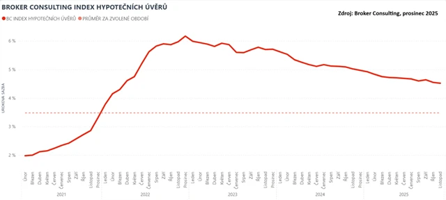 Průměrná úroková sazba hypotečních úvěrů v Česku po zářijovém jednorázovém zvýšení druhý měsíc v řadě míří dolů. Podle Broker Consulting indexu hypotečních úvěrů činila průměrná nabídková sazba v listopadu 4,52 %. To představuje pokles o tři bazické body oproti říjnové hodnotě. S výjimkou září se celý letošní rok vyvíjí ve znamení mírného, ale stabilního zlevňování hypoték.