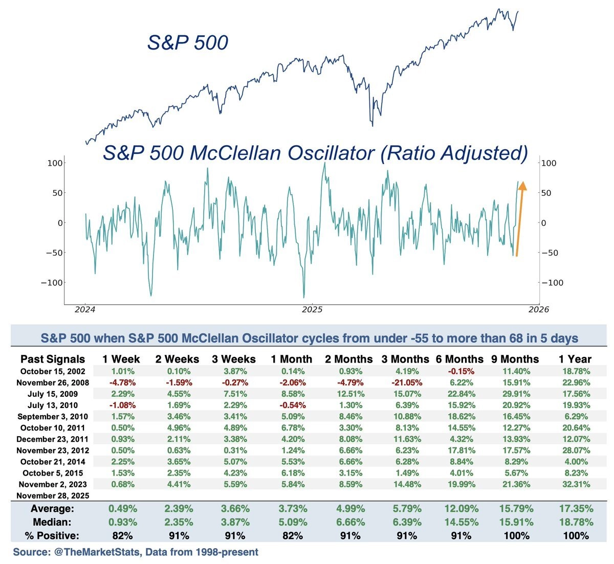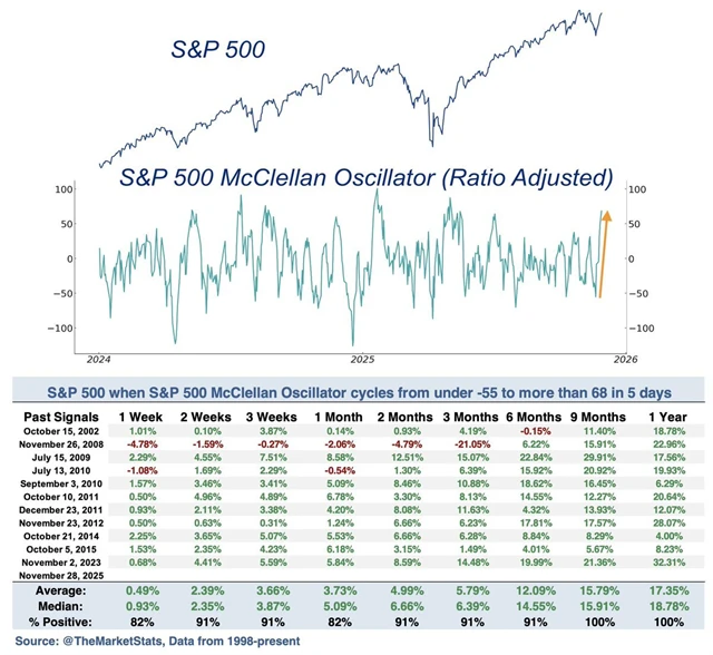 Index S&P 500 během pěti posledních obchodních dnů listopadu výrazně posílil. K jeho růstu přispěla velká část v něm zahrnutých titulů, což zvedlo indikátor zvaný McClellan Oscillator (pojmenovaný je sice po manželech McClellanových, ale česky se nespravedlivě označuje jako McClellanův oscilátor) z -55 na +68.
