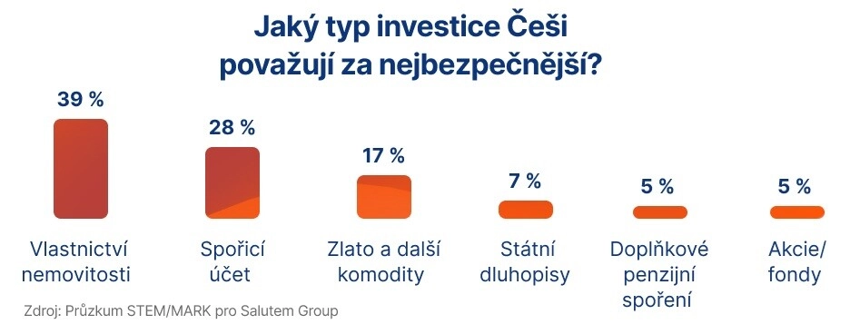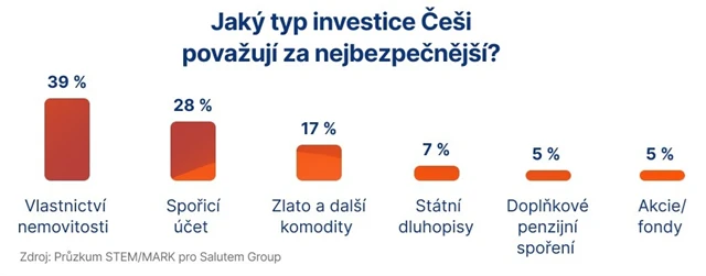Za nejbezpečnější investici považuje 39 % Čechů vlastnictví nemovitosti. Ale podle průzkumu nechává 43 % respondentů své peníze stále na spořicím účtu nebo termínovaném vkladu a další dvě pětiny neinvestují vůbec. Nemovitosti jsou sice pro většinu Čechů srozumitelná, stabilní a konzervativní investice, spousta lidí má ale pocit, že na ně nedosáhne. Často proto, že se dívají jenom na Prahu nebo velká města.