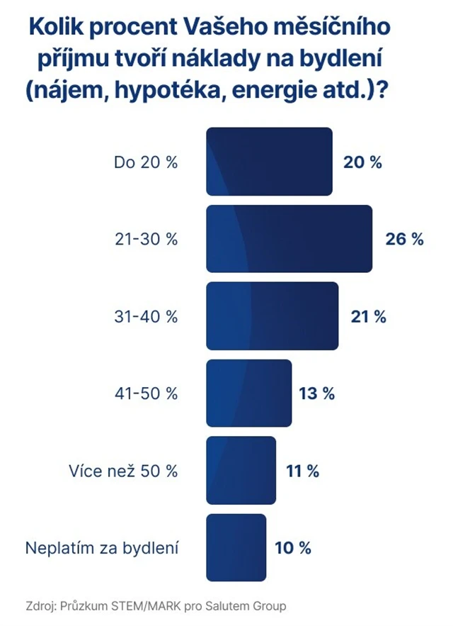 Ve svém a kompletně splaceném bydlení žije pouze 38 % Čechů. Další skoro pětina splácí hypotéku a bezmála třetina bydlí v nájmu. Náklady na bydlení jsou tak pro mnoho lidí likvidační, skoro polovina Čechů (45 %) na ně dává více než 30 % svých příjmů.