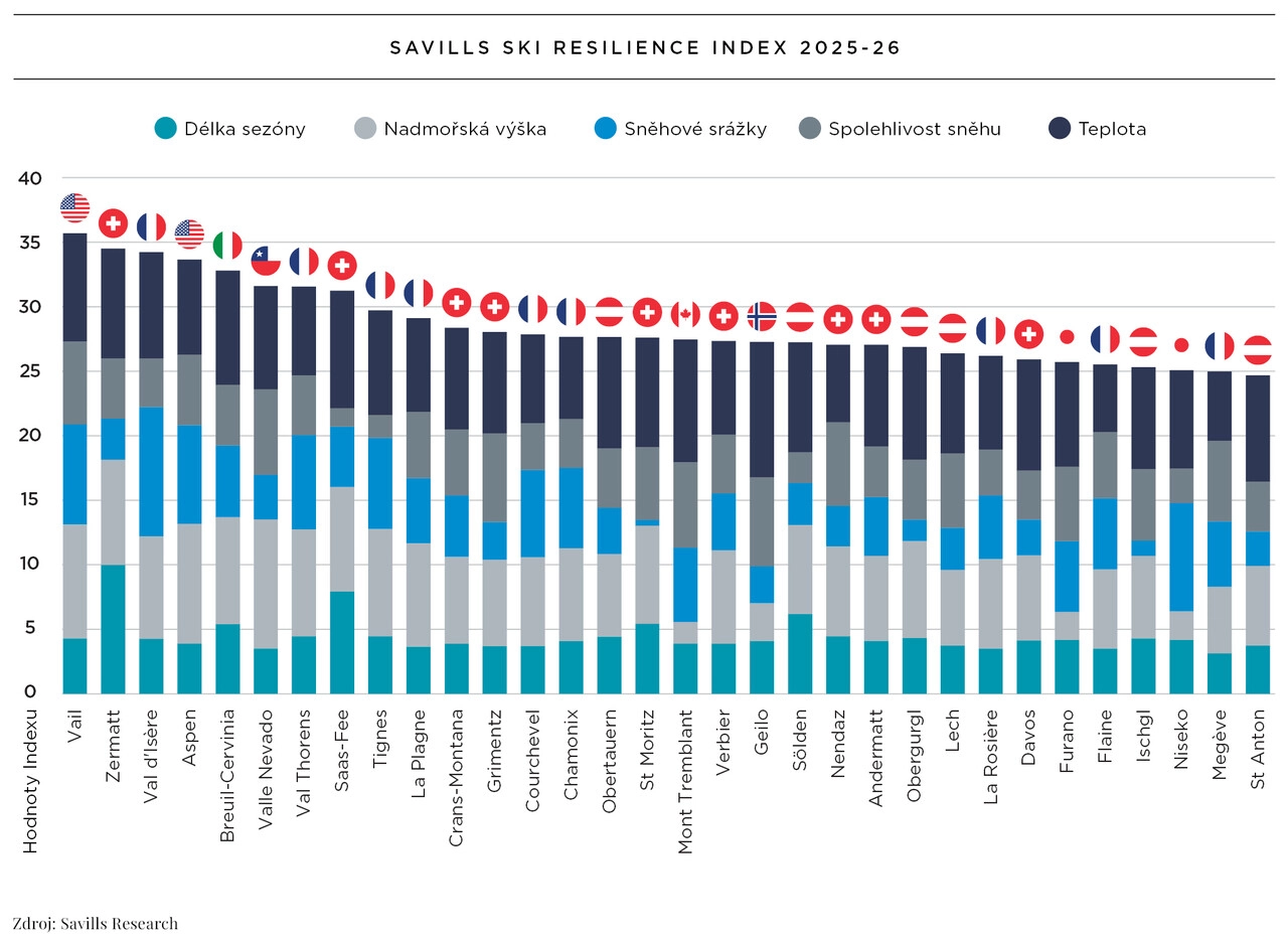 Nejdražší lokality ale automaticky neznamenají nejlepší lyžování. Zatímco sezóna 2024/25 přinesla některým oblastem nadprůměrné množství sněhu, jiné se potýkaly s jeho už dlouhodobým nedostatkem. Nejodolnější v tomto ohledu jsou podle indexu Savills Ski Resilience coloradský Vail, následují Zermatt, Val d’Isère, Aspen a italské středisko Breuil-Cervinia. Tyto destinace těží z kombinace nadmořské výšky, polohy a schopnosti udržet dobré sněhové podmínky.