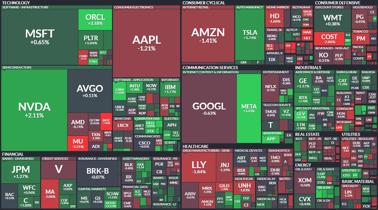 Index Dow klesl o 0,07 % na 47 850,94 bodu, zatímco širší S&P 500 zpevnil o 0,11 % na 6 857,12 bodu a index technologického trhu Nasdaq Composite se zvýšil o 0,22 % na 23 505,14 bodu. Index volatility VIX klesl o 1,87 % na 15,78 bodu a výnos 10letých vládních dluhopisů USA se zvýšil o skoro půl bazického bodu na 4,102 %.