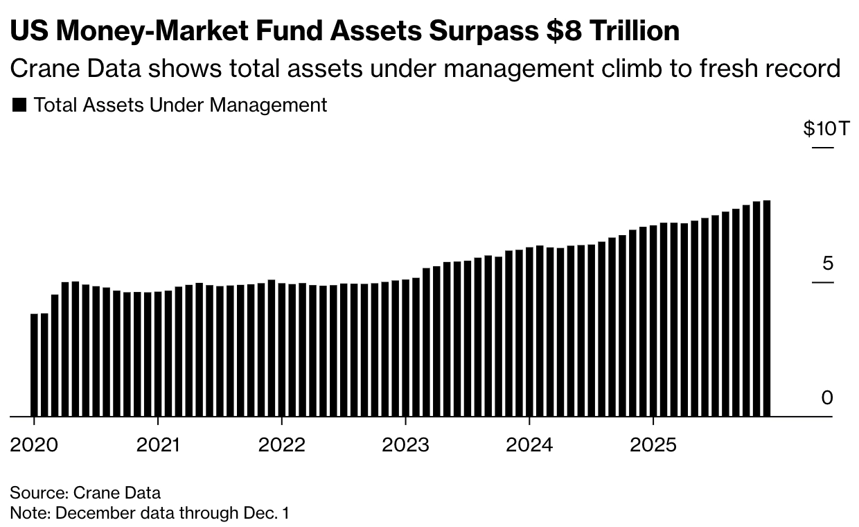 Část investorů v rámci svých portfolií nadále hledá jistotu pro případ, že by se "strhla nějaká tržní mela". Objem dolarů v amerických fondech peněžního trhu tak letos postupně dále roste a na začátku prosince poprvé v historii překročil osm bilionů.