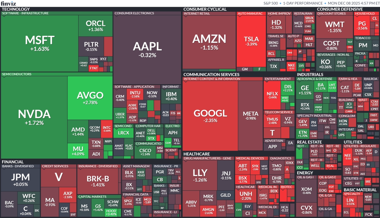 Technologický sektor byl v pondělí růstovou výjimkou na převážně klesajícím trhu. Akcie Broadcomu (+2,78 %) posílily díky zprávám, že Microsoft (+1,63 %) s firmou jedná o vývoji vlastních čipů. Cena akcií společnosti Confluent (+29,08 %) vystřelila po oznámení plánované akvizice firmy ze strany IBM (+0,40 %) v hodnotě 11 miliard dolarů. Oracle přidal před středečním zveřejněním výsledků o 1,35 %.