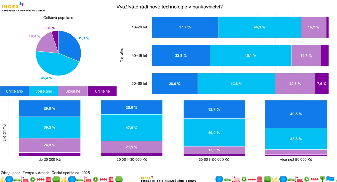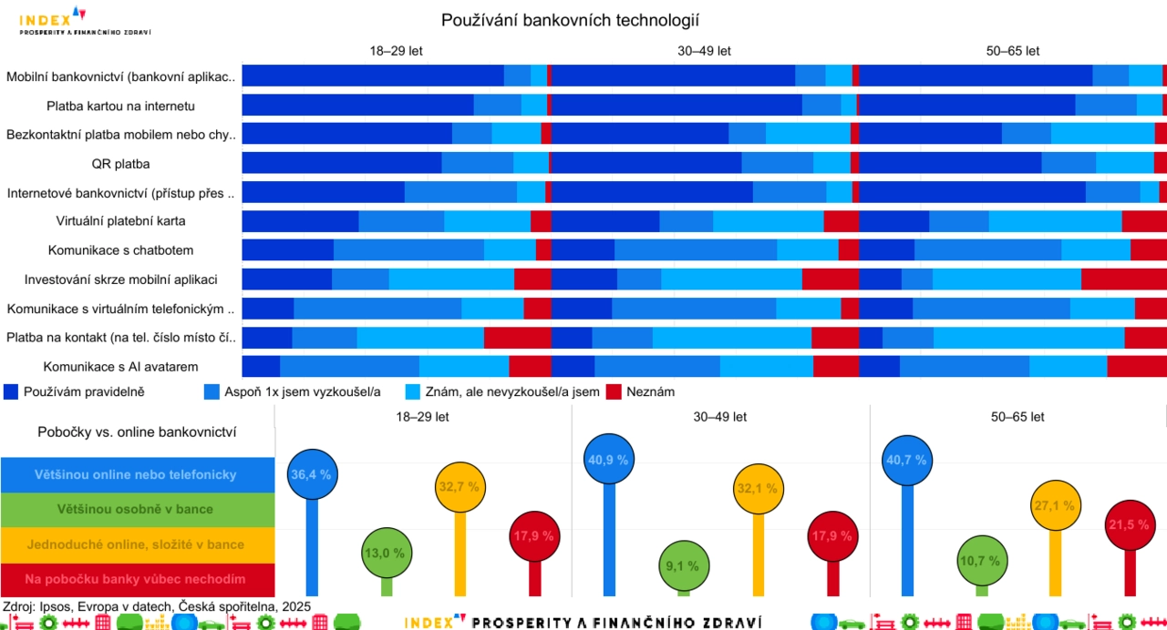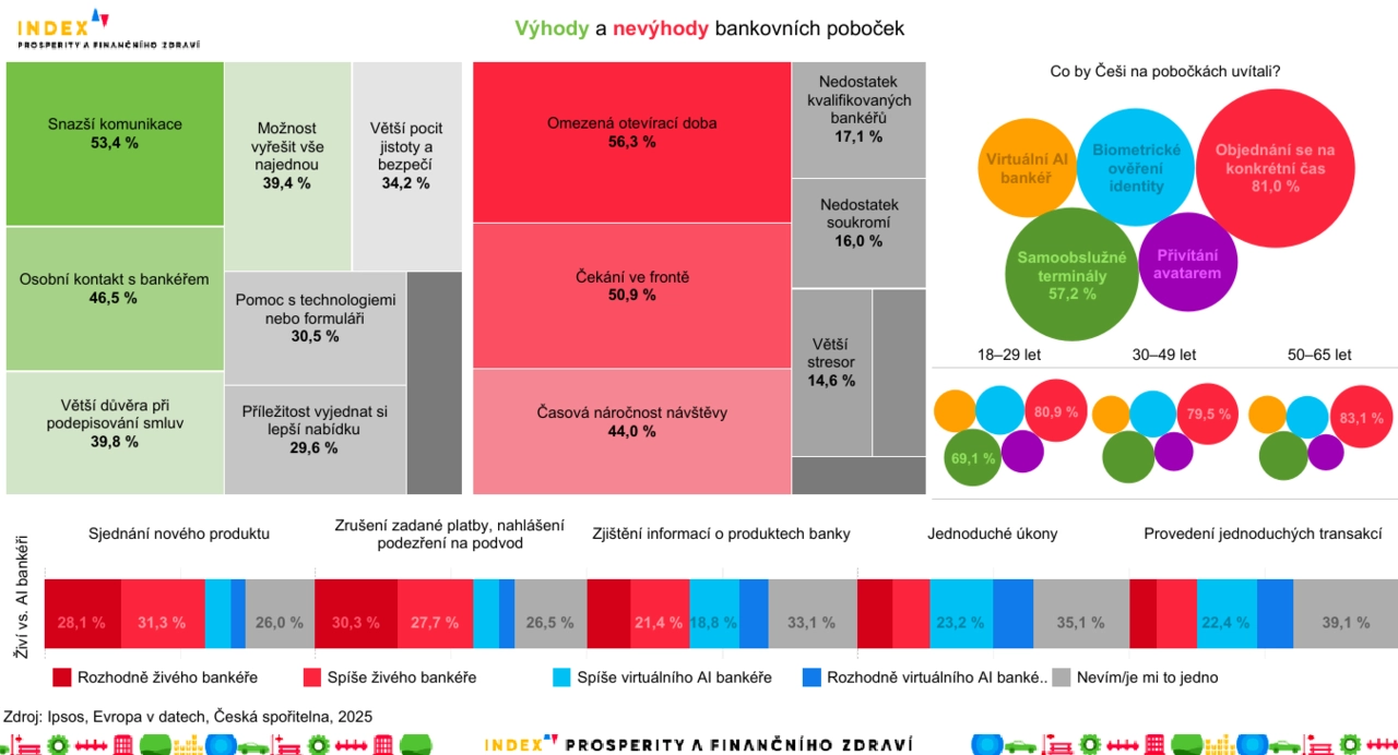 Pozitivní vztah k novým technologiím má 8 z 10 Čechů. Příznivě vnímají i technologické novinky v bankovnictví, nejvíce je láká nepřetržitá dostupnost služeb a úspora času. Největší bariérou zůstávají obavy ze ztráty osobního kontaktu s bankéřem. I proto si skoro 90 % Čechů nepřeje zánik kamenných poboček, které považují za důvěryhodnější místo pro řešení složitějších požadavků. Většina by ale zároveň uvítala modernizaci poboček, nejčastěji ve formě možnosti objednat se na konkrétní čas, samoobslužných terminálů nebo třeba AI asistentů.