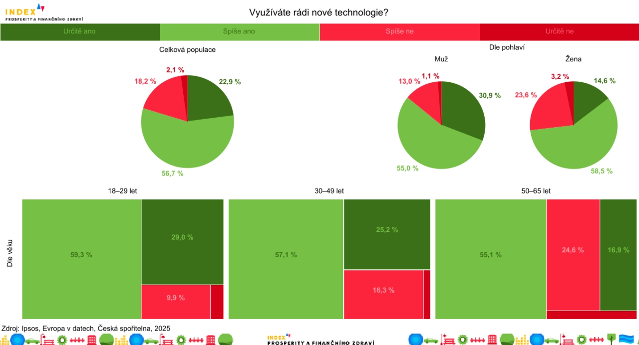 Celkem 8 z 10 Čechů má k novým technologiím pozitivní vztah. Technologie přijímají zejména muži (86 % oproti 73 % žen) a platí, že čím jsou respondenti mladší, tím jsou novým technologiím otevřenější. "Zatímco technologičtí nadšenci tvoří bezmála čtvrtinu populace, vyložených odpůrců jsou jen 2 %. I mezi lidmi ve věku 50–65 let odpor k technologiím nepřesahuje 3,5 %. Otevřenost přitom roste s úrovní vzdělání i osobním příjmem," vysvětluje Tomáš Odstrčil, šéfredaktor Evropy v datech.