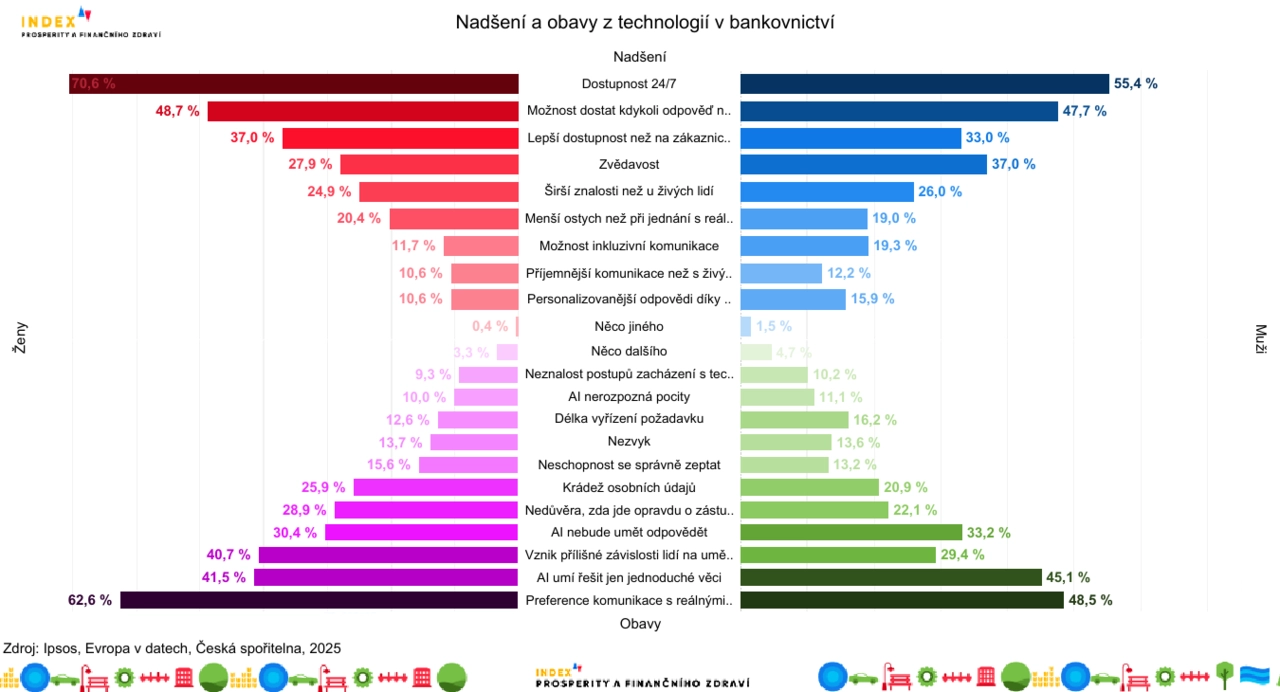 Také k technologiím v bankovnictví se staví ženy zdrženlivěji než muži. Jejich hlavní obavou je ztráta kontaktu s reálnými lidmi. Jako problém to vnímá 63 % žen (oproti 49 % mužů). Z jedenácti nástrojů v průzkumu Indexu prosperity a finančního zdraví pro Českou spořitelnu a portál Evropa v datech, mezi které byly zařazeny běžné záležitosti od bezkontaktních plateb až po komunikaci s AI asistenty, předstihly ženy v pravidelném používání digitálních nástrojů muže jen v případě mobilního bankovnictví, a to jen o 1,5 procentního bodu.