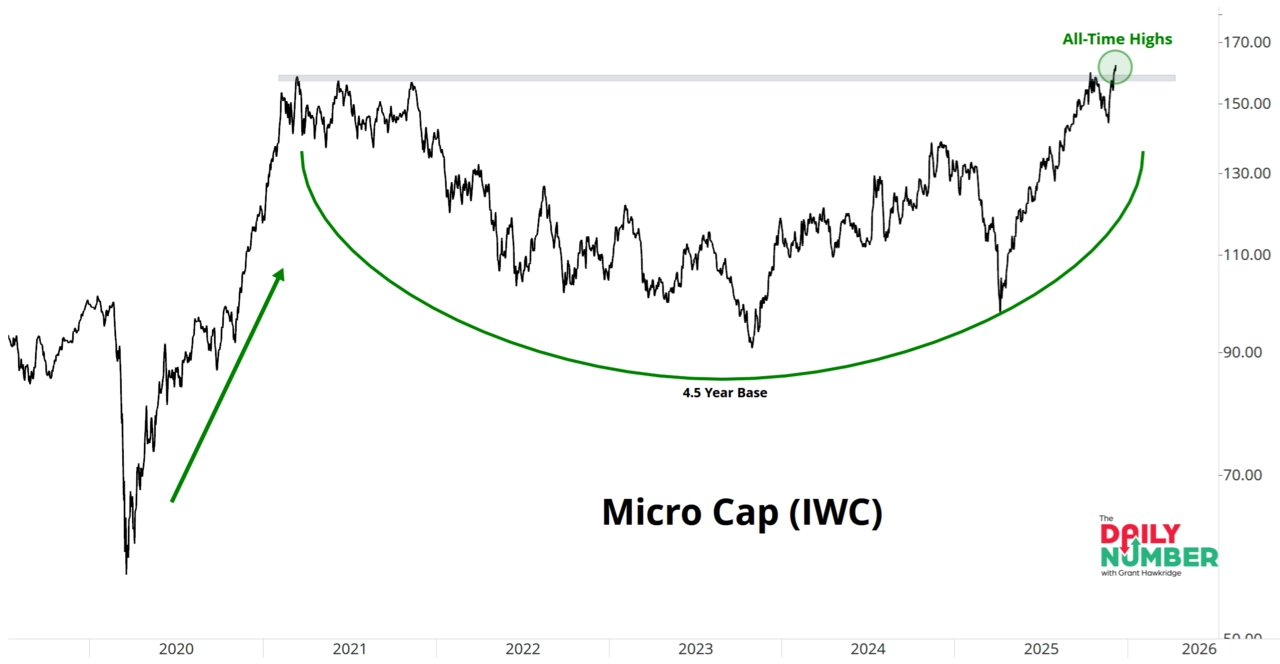 A pak jsou tu ještě menší firmy, takzvané micro caps. Burzovně obchodovaný fond iShares Micro-Cap (IWC) už v očekávání dalšího snižování úroků v USA prorazil nad historická maxima z roku 2020. A vzestup na maximum po tak dlouhé době je velice silným optimistickým technickým signálem a projevem toho, že obchodníci na akciovém trhu jsou ochotní jít do rizika.