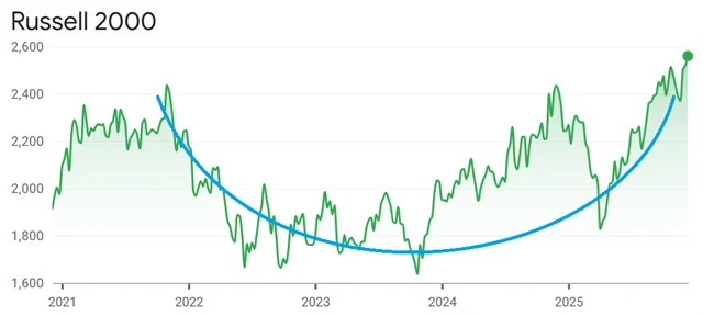 Těsně pod maximem jsou jak široký index akcií velkých firem S&P 500, tak tradiční Dow. Nasdaqu chybí něco přes procento, zatímco index akcií malých firem Russell 2000 vylepšuje rekordy už od 4. prosince. Právě menším firmám, často s těžištěm byznysu v USA, mohou nižší sazby pomáhat nejvíce, protože jsou v průměru častěji závislé na dluhovém financování.