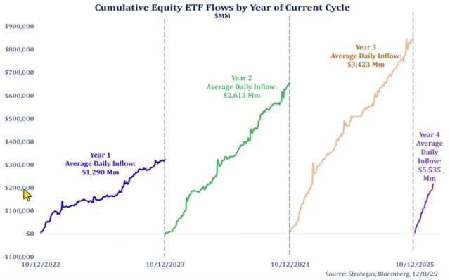 Za poslední tři měsíce v amerických akciových ETF přibylo zhruba 300 miliard dolarů. Ukazuje se, že na začátku čtvrtého roku býčího trendu indexu S&P 500 je o americké akcie zájem. Zatímco v prvním roce trendu (říjen 2022 až říjen 2023) ve fondech přibývalo asi 1,3 miliardy dolarů denně, teď je to okolo 5,5 miliardy dolarů denně.