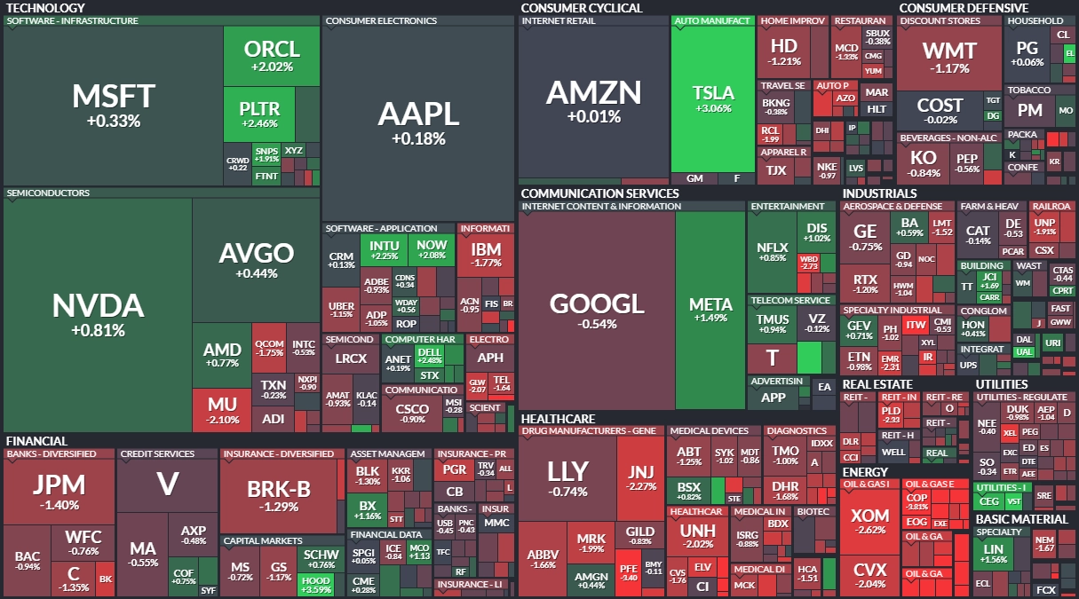 Index Dow klesl o 0,62 % na 48 114,26 bodu a širší S&P 500 se snížil o 0,24 % na 6 800,26 bodu, zatímco index technologického trhu Nasdaq Composite se zvýšil o 0,23 % na 23 111,46 bodu. Index volatility VIX klesl o 0,12 % na 16,48 bodu a výnos 10letých vládních dluhopisů USA se snížil o tři a půl bazického bodu na 4,147 %.