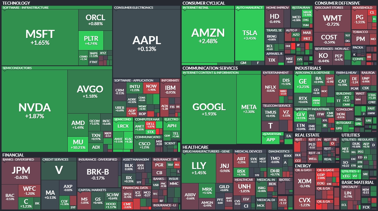 Index Dow přidal 0,14 % na 47 951,85 bodu, širší S&P 500 se zvýšil o 0,79 % na 6 774,76 bodu a index technologického trhu Nasdaq Composite uzavřel se ziskem 1,38 % na 23 006,36 bodu. Index volatility VIX spadl o 4,26 % na 16,87 bodu a výnos 10letých vládních dluhopisů USA klesl o skoro tři bazické body na 4,124 %.