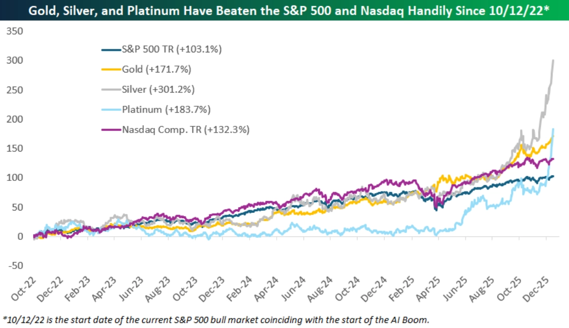 Ještě impozantnější byl růst ceny platiny na nové historické maximum. Díky tomu nejen stříbro a zlato svým zhodnocením od října 2022, kdy poslední medvědí trend amerického akciového indexu S&P 500 dosáhl dna, překonávají akciové indexy v USA. I po zohlednění dividend.